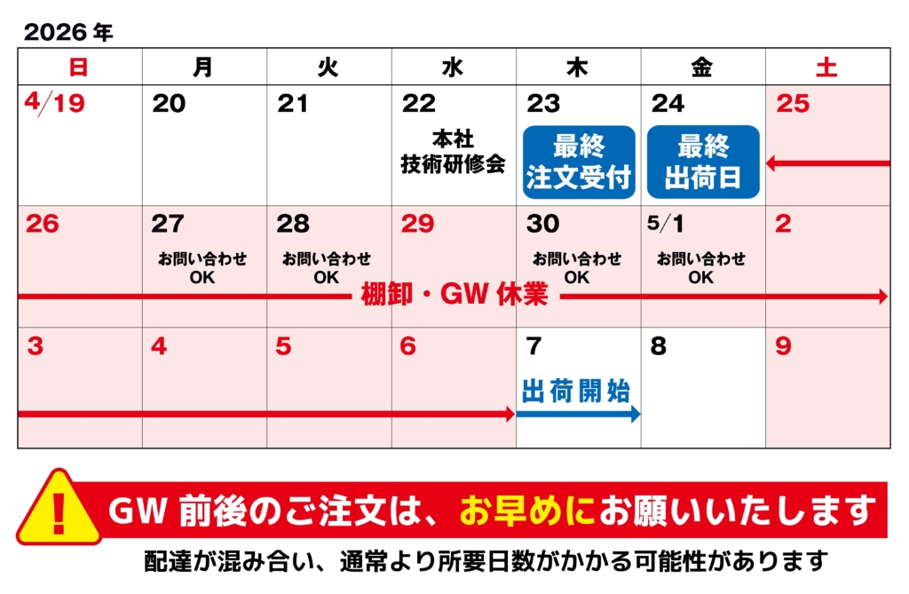 2026年GW期間の出荷業務休止のお知らせ