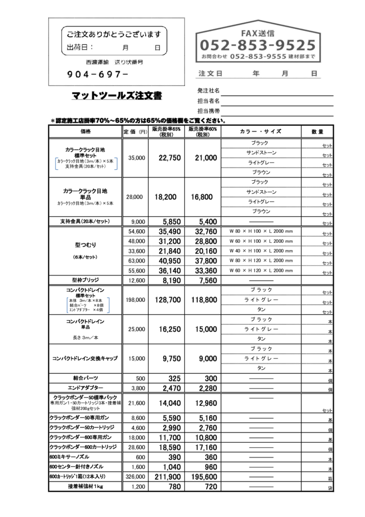 MAT最新ニュース 注文書ダウンロード 注文書ダウンロード 2025.09.01 注文書ダウンロード マットスプレー注文書 ダウンロード マットスプレー注文書説明 見本を見る マットスタンプ注文書 ダウンロード マットスタンプ注文書説明 見本を見る カタログ注文書 ダウンロード マットツールズ注文書 ダウンロード ニュースTOP 次へ MAT最新ニュース配信中! カテゴリ ピックアップ認定施工店!技術研修会マットスプレーの施工技術マットスタンプ の施工技術マットスプレーの補修方法マットスタンプの補修方法お知らせ施工現場のご紹介注文書ダウンロードデータダウンロード 最新の記事 【第620回】ご要望にお応えしてステンシル目地のカット販売をスタートします! 注文書ダウンロード 【第619回】第4回本社技術研修会参加者募集! 【第618回】2025年夏季休業のお知らせと高温時施工の注意点について 【第617回】2025年度第3回技術研修会報告 【第616回】戸建お客様用チラシが出来ました! 登録についてはこちら 認定施工店が全国で活躍しています!