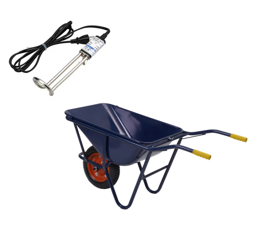 また、シーラー類も寒さで固まってしまう場合があります。現場で、一輪車などに水を張り投げ込みヒーターでお湯を沸かし、湯せん用の場所を作る施工店さんもいらっしゃいます。吹き付け材作るときと、シーラー類の湯せん用に使えてとても便利です。