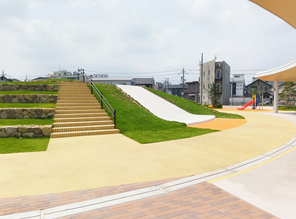 階段部分もマットスプレーが施工されています。このくらいの段差であれば問題なくマットスプレーの施工ができます。地域のみなさんの憩いの場として安心に過ごせる公園になりました。
