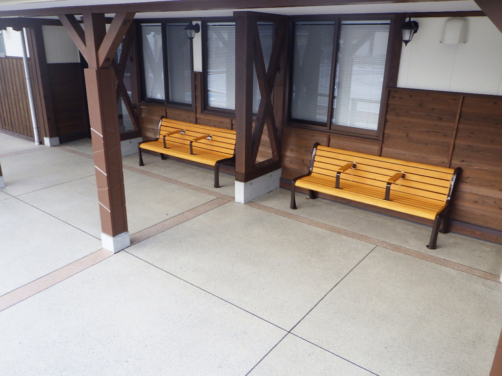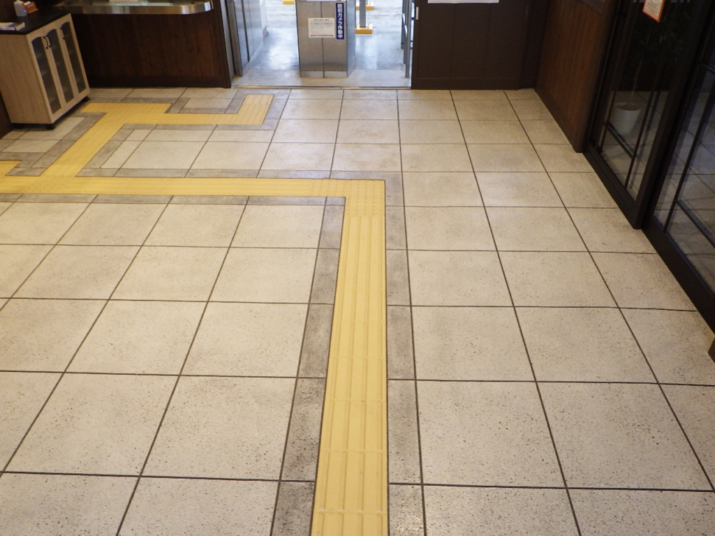 駅の構内の床面に採用いただきました。こちらではステンシル柄を貼り付けず、目地テープでデザインを作っています。広島県の認定施工店の新和鋪道様が施工されました。